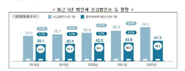 흑자 신고법인은 61만5000개로 5년 전과 비교해 13만 2000개 늘었고, 적자 신고법인은 36만7000개로 5년 전 대비 11만개 증가했다. 다만 증가율로는 흑자 신고법인(27.3%)보다 적자 신고법인의 증가율(42.8%)이 더 높았다.