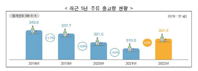 먼저 작년 주류 출고량은 327만4000㎘(킬로리터)로 전년(310만㎘) 대비 5.6% 늘어난 것으로 집계됐다. 지난해 4월 거리두기 해제 이후 대면활동이 활발해지면서 주류 출고량이 늘어난 것으로 해석된다.