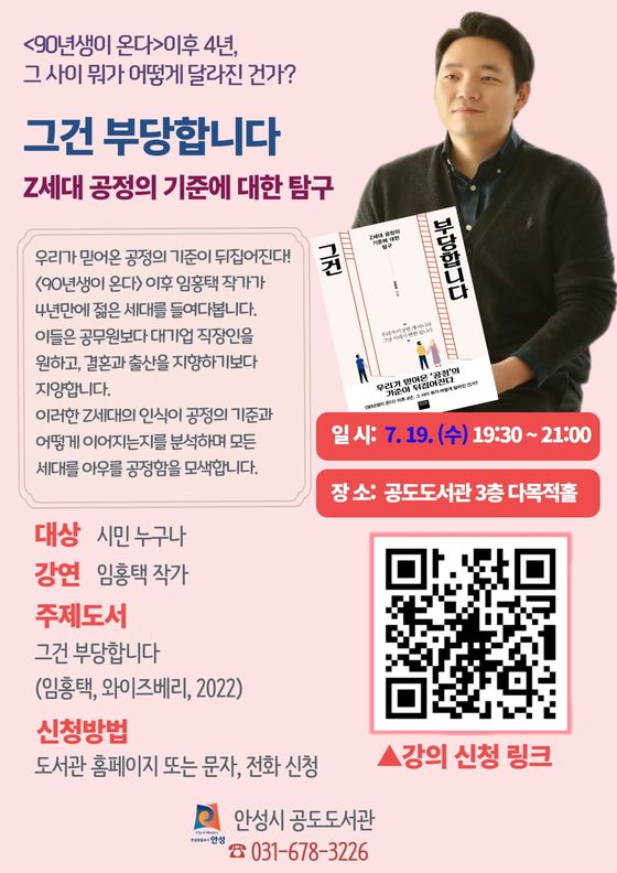 안성시 공도도서관에서는 오는 7월 19일 수요일 오후 7시 30분「그건 부당합니다」인문학 강연을 공도도서관 3층 다목적홀에서 진행한다.