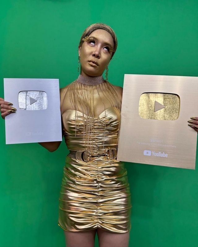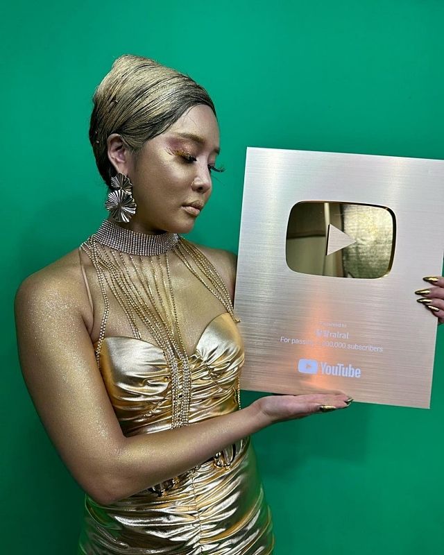 공개된 사진 속 랄랄은 100만 구독자를 달성한 유튜버에게 지급되는 골드 크리에이터 어워드(골드 버튼)를 들고 포즈를 취하고 있다.