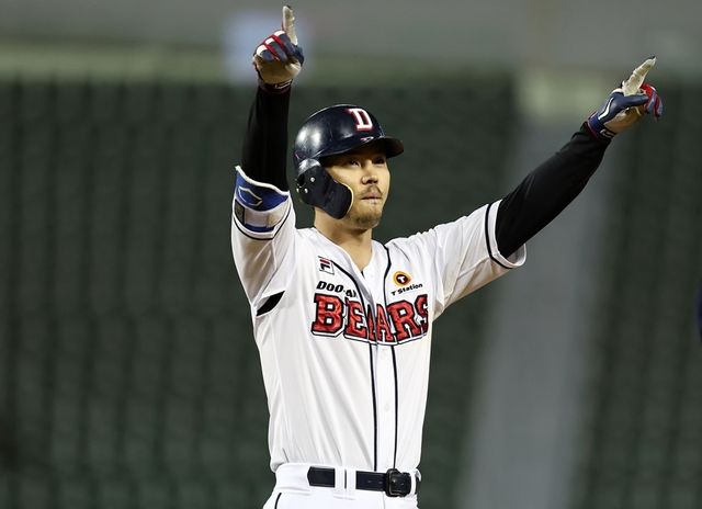 오재원이 지난해 4월 27일 잠실야구장에서 열린 2022 KBO리그 NC 대 두산 경기에서 8회 말 2사 2루 때 적시타를 친 후 기뻐하고 있다. / 이하 연합뉴스