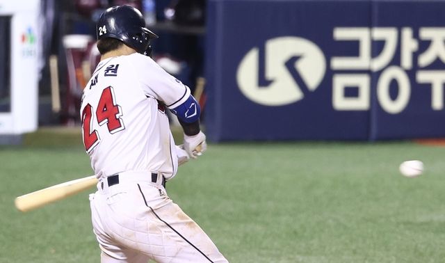 오재원이 2021년 5월 11일 서울 잠실야구장에서 열린 2021 KBO리그 키움 히어로즈와 두산 베어스의 경기에서 6회 말 2사 2, 3루 상황에서 2타점 적시타를 치고 있다.