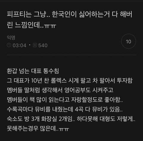 그러면서 "(피프티피프티) 수록곡마다 뮤비를 내줬는데 4곡 다 뮤비가 있다. 숙소도 방 3개 화장실 2개"라며 "하다못해 대형 기획사도 저렇게 못 해주는 경우 많은데..."라고 씁쓸함을 드러냈다.