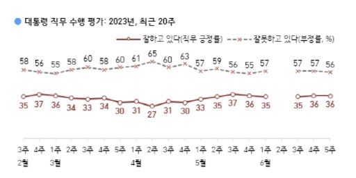 한국갤럽은 지난 27일부터 29일까지 전국 만 18세 이상 1007명을 대상으로 조사(6월 5주)한 결과 윤 대통령의 직무 수행 평가에서 ‘잘하고 있다’고 응답한 비율은 36%를 기록했다. 지난 조사(6월 4주)와 비교해 변동이 없었다.