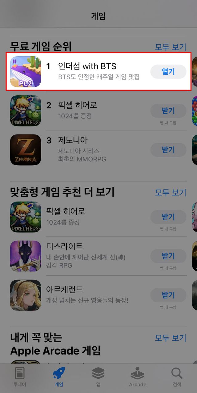 ‘인더섬 with BTS’는 이달 ‘BTS 데뷔 10주년 기념 대규모 업데이트’ 및 ‘서비스 1주년 기념 이벤트’가 시작된 후 지난 27일과 28일 애플 앱스토어와 국내 구글 플레이 스토어, 양대 앱 마켓에서 인기 1위를 기록했다.