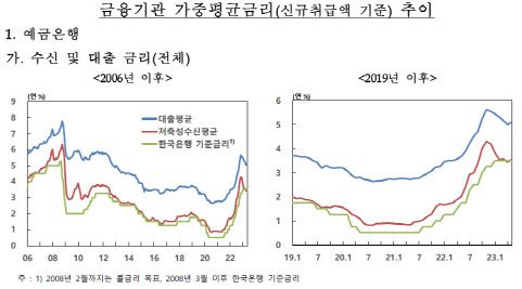 한편 비은행 금융기관 금리는 상호저축은행을 제외하고 모두 하락했다. 상호저축은행은 자금유치 노력을 강화함에 따라 1년 만기 수신 금리가 0.24%포인트 상승한 4.04%를 기록했다. 반면 대출 금리는 0.03%포인트 내린 12.24%로 집계됐다. 새마을금고는 수신금리가 0.03%포인트 하락했고, 대출금리는 0.17%포인트 떨어졌다.
