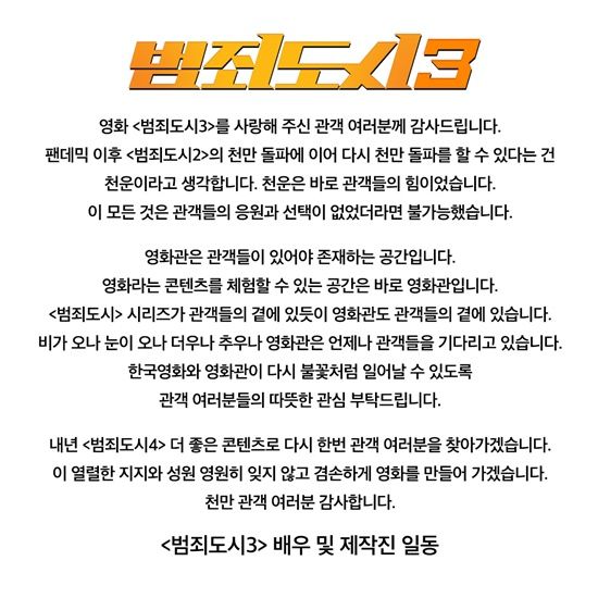또 "영화관은 관객들이 있어야 존재하는 공간이다. '범죄도시' 시리즈가 관객들의 곁에 있듯이 영화관도 관객들의 곁에 있겠다. 한국영화와 영화관이 다시 일어날 수 있도록 관객 여러분의 따뜻한 관심 부탁드린다"며 "내년 '범죄도시4'로 다시 한 번 관객들을 찾아가겠다. 열렬한 지지와 성원을 잊지 않고 겸손하게 영화를 만들어가겠다"며 거듭 인사를 전했다.