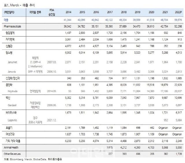 이호철 하이투자증권 연구원은 1일 “머크의 올해 1분기 매출액은 전년 대비 9% 감소한 145억달러, 영업이익은 33% 줄어든 37억달러를 기록했다”며 “코로나 경구 치료제 라게브리오 영향으로 전체 매출은 감소했으나, 이를 제외한 실적은 전년 동기 대비 11% 증가했다”고 진단했다.