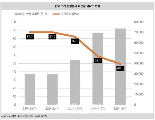 아파트 초기 분양률은 분양 시작 이후 3개월부터 6개월까지 분양비율을 나타내는 지표다. 지난해 1분기 전국 민간 아파트 초기 분양률은 87.7%였다가 지난해 3분기 82.3%로 하락한 후 지난 1분기 49.5%까지 떨어졌다. 초기 분양률이 하락하면 미분양률이 상승한다.