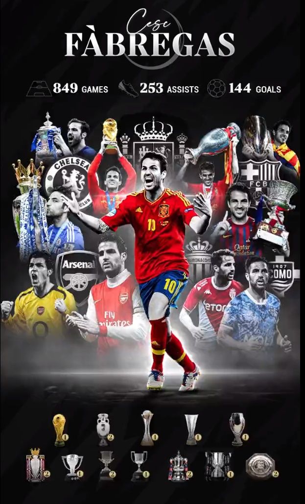 아스널에서 뛴 8년 동안 파브레가스는 303경기에 나와 57골 95도움이라는 엄청난 스탯을 기록했다. 이후 친정팀인 바르셀로나로 합류해 라리가 우승 1회를 포함해 트로피 6개를 들어 올렸다.