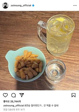2일 조인성은 자신의 인스타그램에 과자 안주와 술잔을 찍은 사진을 올리며 "8연승 얼마 만인가. 도저히 안 먹을 수 없네"라며 감격을 표했다.