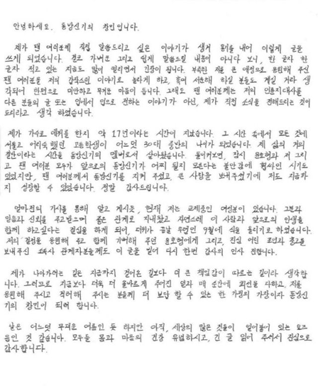 이어 "저의 결정을 응원해 주고 함께 기뻐해 주던 윤호형, 그리고 진심어린 조언과 충고를 보내주신 소속사 관계자분들께도 이 글을 빌어 다시 한 번 감사의 인사를 전한다"라며 "제가 나아가려는 길은 지금까지 걸어온 길보다 더 큰 책임감이 따르는 길이라 생각한다. 그러므로 지금보다 더욱 더 올바르게 주어진 일과 매 순간에 최선을 다하고, 저를 격려해 주신 분들께 보답할 수 있는 한 가정의 가장이자 동방신기의 창민이 되려한다"라는 각오를 다졌다. 이후 결혼 2년 만인 지난해 10월 첫 딸을 품에 안았다는 소식을 알렸다.