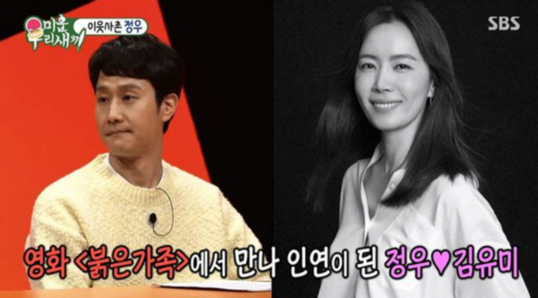 정우는 아내 김유미와 처음 만났을 때 “첫 모습에서 후광이 비쳤다. 그때는 사귈 생각도 못 했다. 경력으로도 선배고 나이도 연상이었다”고 말하며 “사귀고 나서 이 사람과 결혼할 것 같다”고 설명했습니다.