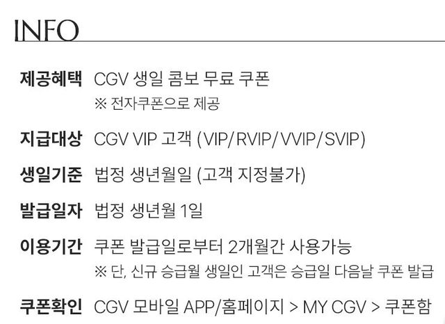 CGV, 롯데시네마는 VIP 고객 대상으로 생일콤보 무료 쿠폰을 제공한다. 쿠폰은 발급일로부터 2개월(CGV), 7일(롯데시네마) 동안 사용할 수 있다. 메가박스는 생일자 대상 팝콘 L 사이즈 무료 쿠폰을 제공한다.