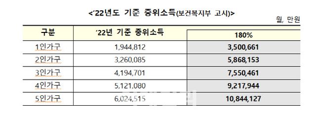 가구소득의 경우 가입 신청자 본인을 포함한 가구원 소득의 합(2022년 기준)이 보건복지부에서 고시하는 2022년도 기준 중위소득의 180% 이하를 충족해야 한다. 가구원은 원칙적으로는 가입 신청자의 주민등록등본에 기재된 배우자, 부모, 자녀, 미성년 형제·자매를 기준으로 판단한다.