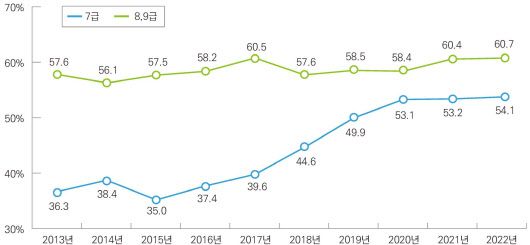 같은 기간 지자체 5급 이상 공무원 2만 5908명 중 여성은 7109명으로 27.4%에 그쳤다. 다만 2021년과 비교해 3.1%p 높아졌으며, 5급으로 승진할 수 있는 6급 여성공무원의 비율도 45.8%로 전년 대비 1.8%p 올랐다.