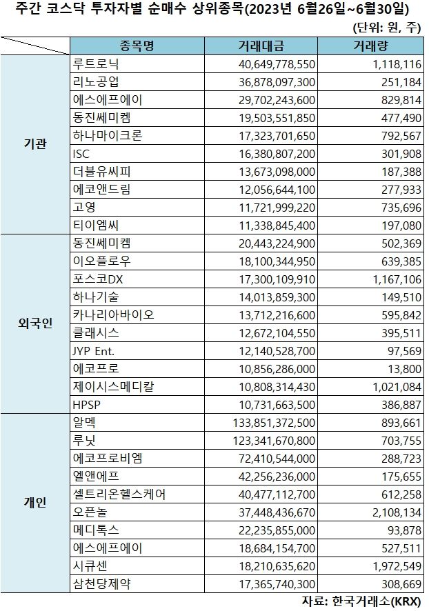 [표] 주간 코스닥 기관·외인·개인 순매수 상위종목(6월26일~6월30일)