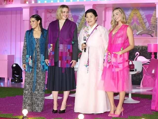 2日,在位于首尔永登浦区的时代广场,电影《芭比》举行首映礼,主演亚美莉卡·费雷拉(左起)、导演格蕾塔·葛韦格玛、韩服设计师朴述女、主演玛格特·罗比等身穿韩服亮相。