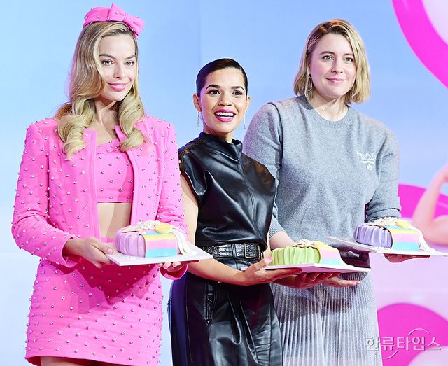 할리우드 배우 아메리카 페레라, 마고 로비, 그레타 거윅 감독이 3일 오전 서울 종로구 포시즌스 호텔 서울에서 열린 영화 '바비' 내한 기자간담회에 참석해 포토타임을 갖고 있다.