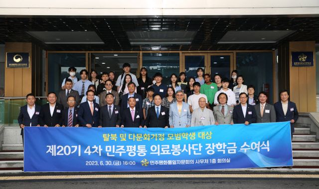 [이데일리 이순용 기자] 민주평화통일자문회의 (민주평통) 의료봉사단(단장 김철수)은 지난 6월 30일에 북한이탈주민과 다문화 가정 모범학생을 대상으로 한 ‘민주평통 의료봉사단 장학금 수여식’을 사무처에서 개최했다.