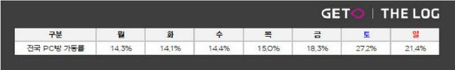 6월 5주 전국 PC방 총 사용시간은 약 1천 986만 시간으로 전주 대비 12.2% 증가, 전월 대비 19% 증가, 전년 대비 11.9% 증가한 수치이다. PC방 주간 가동률은 평일 평균 15.2%, 주말 평균 24.3%로 주간 평균 17.8%를 기록했다.