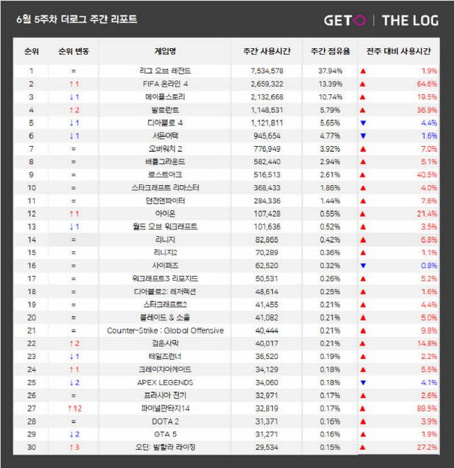 전주 대비 사용시간이 36.9% 증가하며 2계단 상승한 4위를 기록한 발로란트는 6월 28일 진행한 에피소드 7 업데이트의 효과가 나타나 사용시간이 증가하며 한 주를 마무리했다.