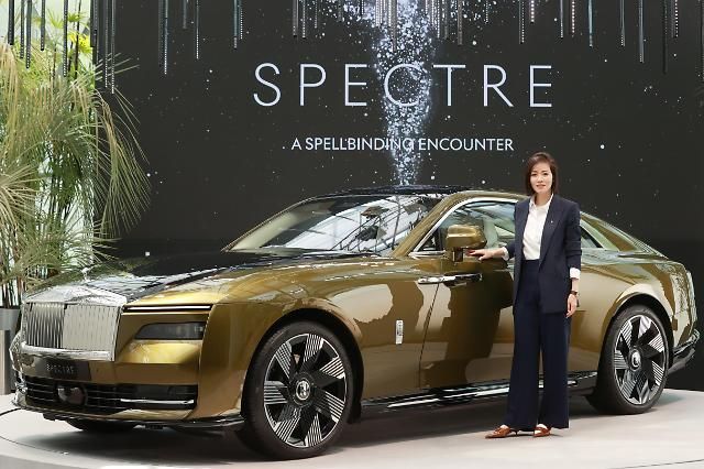 上月16日,劳斯莱斯在首尔江南公开旗下首款电动车“闪灵”(Spectre),图为劳斯莱斯亚太区董事艾琳尼肯向媒体展示新车。【图片提供 韩联社】