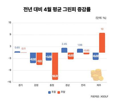 골프장 그린피 가격이 하락세를 나타내고 있다. 국내 최대 골프 부킹 플랫폼 XGOLF는 지난 4월 그린피를 분석하며 이같이 밝혔다. 이번 조사는 실제 회원들이 예약한 골프장 이용요금을 기반으로 올해와 지난해 4월 그린피 데이터를 산출했다.