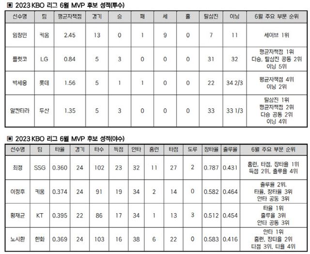 [이데일리 스타in 이석무 기자] 2023 신한은행 SOL KBO 리그 6월 월간 MVP 후보로 총 8명 선수가 확정됐다.