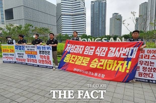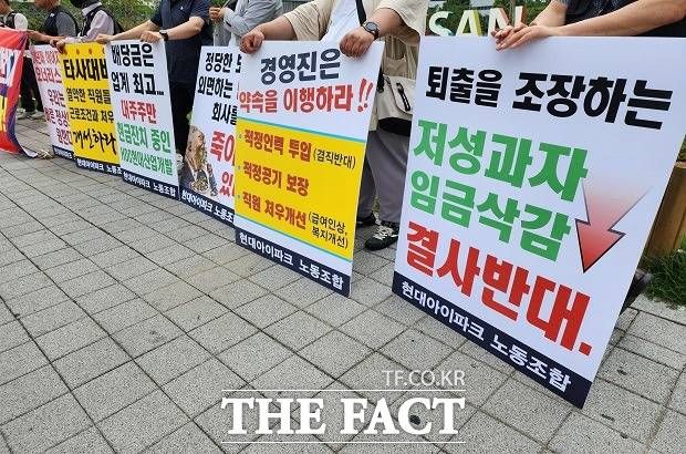 4일 오전 HDC현대산업개발 본사가 있는 서울 용산구 용산역 앞에서 한국노총 현대아이파크 노동조합 소속 전국 임시대의원 10여명은 피켓을 들고 단체 구호를 외쳤다. 이들은 근로조건과 처우 개선을 요구했고, 미온적인 태도로 일관하는 정몽규 HDC 회장과 HDC현대산업개발 경영진을 강도 높게 비판했다.