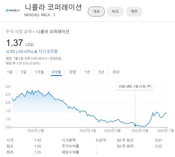 상장 폐지 통보를 받았다는 소식이 전해지자, 니콜라 주가는 그날에만 20% 가까이 하락했습니다. 상장 폐지 우려에 주가는 계속 떨어지면서 6월 6일 종가 기준 0.54달러까지 하락하기도 했습니다.