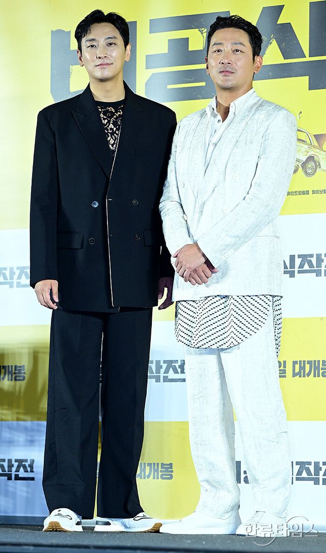 배우 하정우, 주지훈이 4일 오전 서울 용산구 아이파크몰 CGV에서 열린 영화 '비공식작전' 제작보고회에 참석해 포토타임을 갖고 있다.