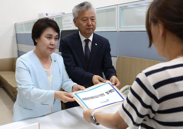 정춘숙(왼쪽), 홍성국 더불어민주당 의원이 4일 오전 서울 여의도 국회에서 김기현 국민의힘 대표의 ‘마약 발언’과 관련해 징계안을 의안과에 제출하고 있다.(사진=뉴스1)