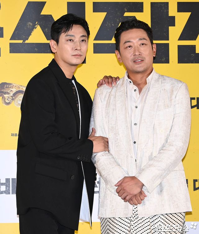 이날 제작보고회에 참석한 배우 주지훈, 하정우가 포즈를 취하고 있다.