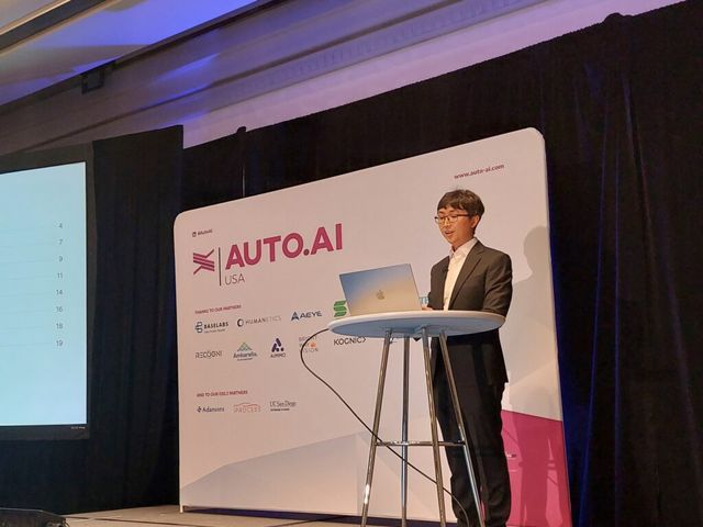 에이모 자율주행 R&D팀 이해봄 수석연구원이 ‘AUTO.AI USA 2023’의 발표 세션에서 ‘Generative Models in Data-centric AI’를 주제로 발표하고 있다