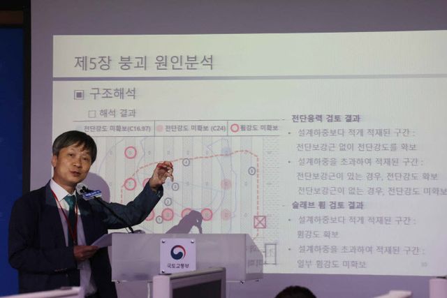 전체 구조물을 분석한 결과 붕괴구간 인근 기둥 32개소 중 11개소는 전단강도가 부족했다. 9개소는 휨강도 부족을 확인했고 이중 7개소는 전단강도 부족, 휨강도 부족이 동시에 발생했다. 특히, 전단강도가 부족한 기둥 11개소에 전단보강근만 있었어도 붕괴사고는 일어나지 않았을 거라는 판단을 내렸다.