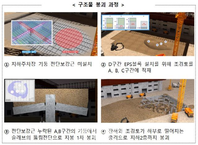 해당 사고는 지난 4월 29일 밤 11시 25분경 202동과 203동 사이 지하 1층 상부 슬래브가 붕괴되고 이어 지하 2층 상부 슬래브가 무너지며 벌어졌다. 다행히 사고발생 시각이 늦은 밤으로 인명피해는 없었다.