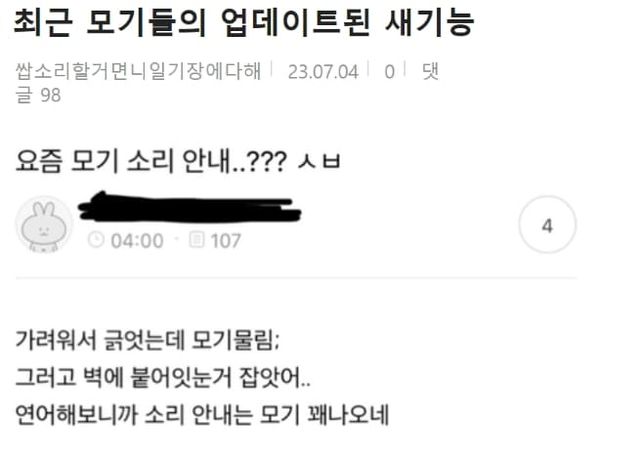 최근 들어 날이 엄청나게 더워지고 있고 모기들도 엄청 활기차게 활동을 하고 있는데 요즘 모기들은 소리를 안내는 신규 업데이트 기능이 생긴 거 같다며 짜증을 내며 글을 썻다.