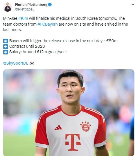 플라텐베르크 기자는 "김민재는 내일 한국에서 메디컬 테스트를 마무리한다"라며 "바이에른 뮌헨 의료진에 현재 현장에 도착해 준비를 하고 있다"라고 전했다.