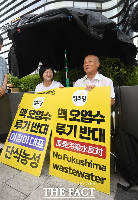 [더팩트ㅣ장윤석 인턴기자] 일본방사성오염수해양투기저지공동행동이 6일 오전 서울 종로구 주한일본대사관 앞 '후쿠시마 핵오염수 해양 투기 저지' 농성장을 방문해 구호를 외치고 있다.