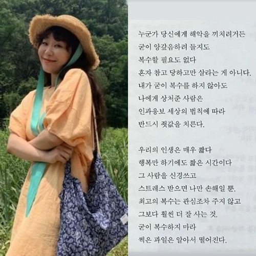 이어 "내가 굳이 복수를 하지 않아도 나에게 상처 준 사람은 인과응보 세상의 법칙에 따라 반드시 죗값을 치른다. 우리의 인생은 매우 짧다. 행복만 하기에도 짧은 시간이다. 그 사람을 신경 쓰고 스트레스 받으면 나만 손해일뿐"이라며 "최고의 복수는 관심조차 주지 않고 그보다 훨씬 더 잘 사는 것. 굳이 복수하지 마라. 썩은 과일은 알아서 떨어진다"라고 써 있다.