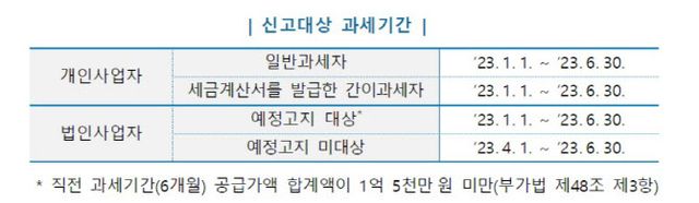 또 세금계산서 발급의무가 있는 간이과세자(전년도 공급대가 4800~8000만원)도 올해 상반기 세금계산서를 발급했다면 신고·납부 대상이다. 또 세금계산서를 발급하지 않은 간이과세자(공급대가 4800만원 미만)는 직전 과세기간의 절반에 해당하는 예정부과세액(50만원 미만 제외)을 납부하고 이후 내년 1월 신고시 공제하면 된다.