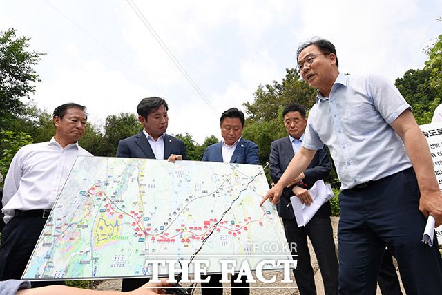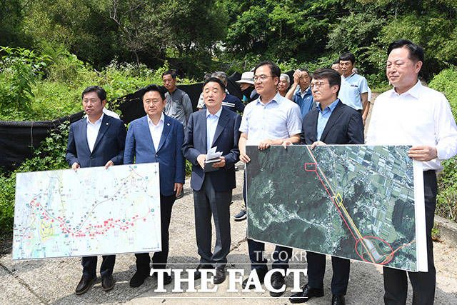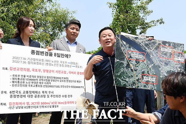 [더팩트ㅣ양평=남용희 기자] 강득구 더불어민주당 서울-양평 고속도로 특혜 의혹 진상규명 TF 단장과 의원들이 6일 오전 경기도 양평군 강상면 고속도로 종점 변경지점 인근 특혜 의혹 현장을 찾아 서울-양평 고속도로 특혜 의혹 관련 발언을 하고 있다.
