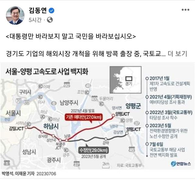 (뉴스영 김영식 기자) 해외 순방중인 김동연 경기도지사가 지난 6일 자신의 SNS를 통해 ‘서울-양평간 고속도로’ 백지화를 밝힌 국토교통부 장관 발언에 일침을 날렸다.