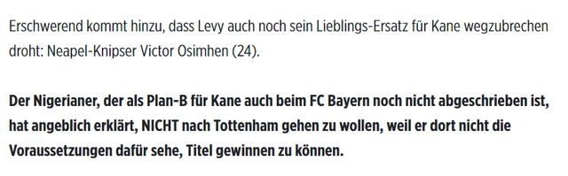 무관에서 벗어나고자 케인이 클럽을 떠나려고 하는 가운데 토트넘이 케인 대체자로 낙점한 오시멘도 우승 가능성이 낮다는 이유로 이적을 원치 않으면서 토트넘과 케인을 원하는 뮌헨 모두 고심에 빠졌다.