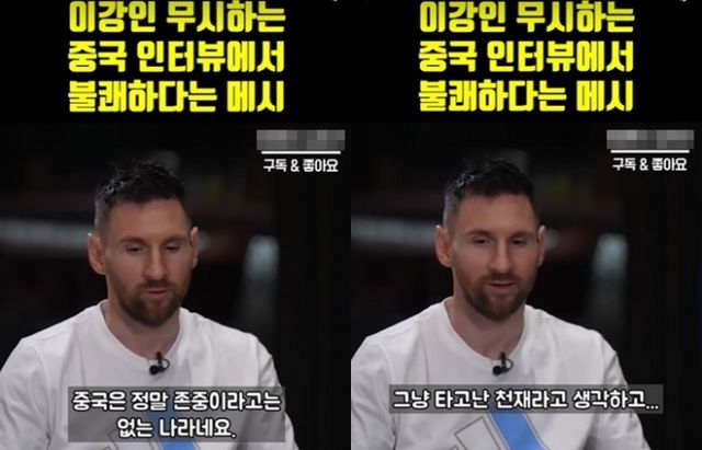 최근 한 유튜브 채널에 '이강인이 무슨 메시 후계자죠? 중국기자 질문에 메시 선수 반응'이라는 제목의 짧은 영상이 공개됐다. 해당 영상 자막을 보면 앵커는 메시에게 "파리에서 당신의 대체자로 이강인이라는 한국 선수를 대체자로 영입한다"며 "중국의 우레이 선수보다 이룬 것도 없는데 메시 선수도 마케팅용이라 생각하느냐"고 물었다.