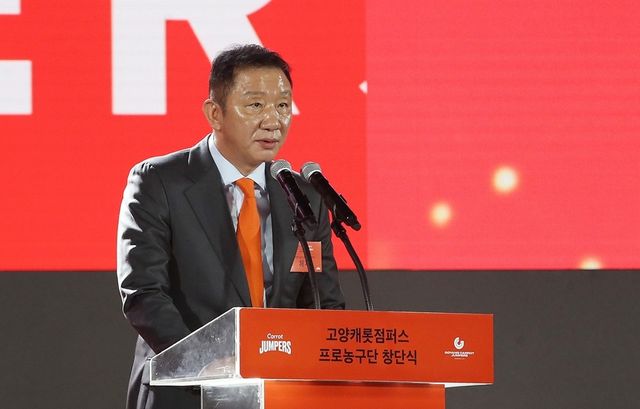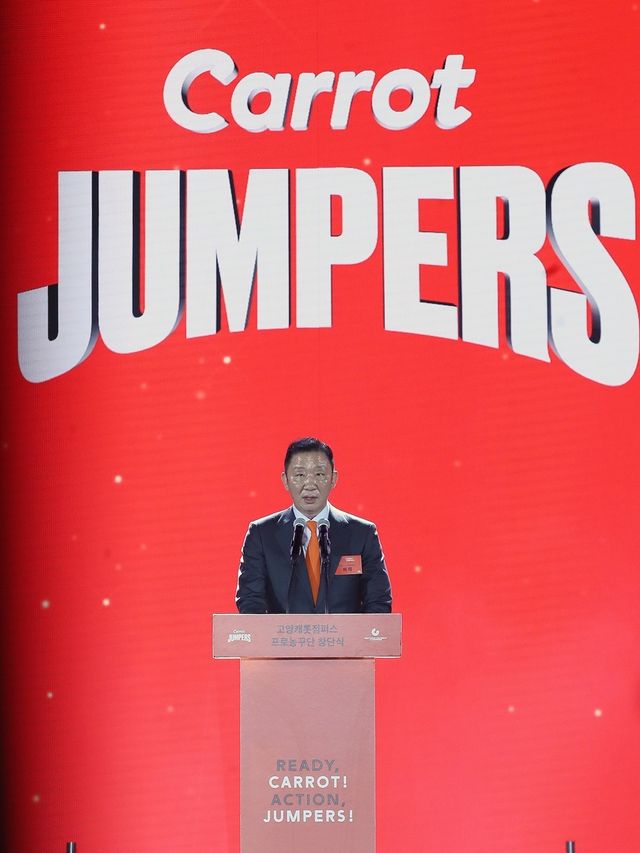 이하 허재 데이원스포츠 대표가 지난해 25일 경기도 고양특례시 일산서구 고양체육관에서 열린 남자 프로농구 '고양 캐롯 점퍼스' 창단식에서 창단포부를 발표하고 있다. / 이하 뉴스1