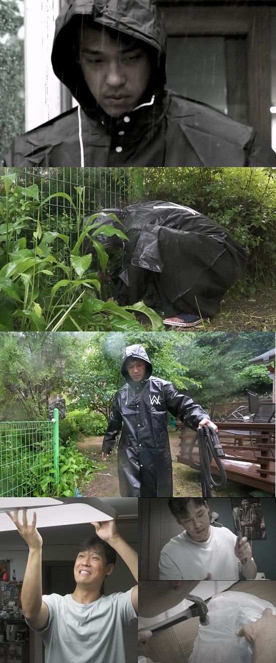 방송에 앞서 공개된 사진 속에는 최재림이 폭우 속에 검은 우비를 입고 마당에 쪼그려 앉아 초집중한 모습이 담겨 있다.