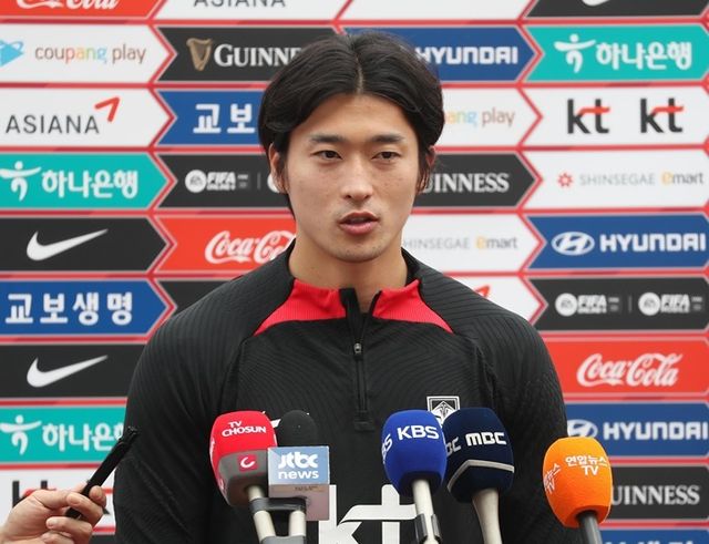 조규성이 지난 6월 페루와의 평가전을 앞두고 취재진과 인터뷰하고 있다.