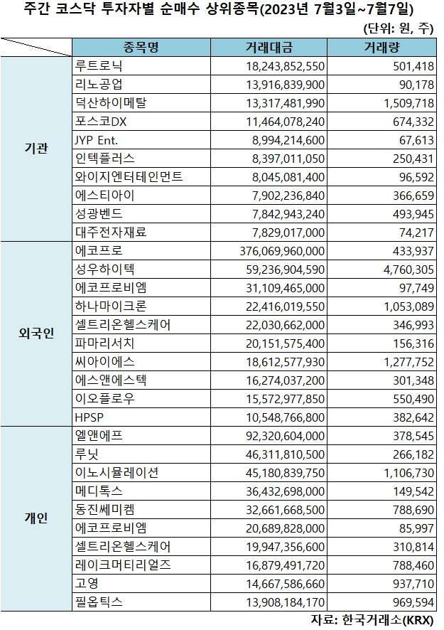 [표] 주간 코스닥 기관·외인·개인 순매수 상위종목(7월3일~7월7일)